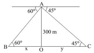 An aeroplane is flying at a height of 300 m above the ground. Flying at this height, the angles of depression from the aeroplane of two points on both banks of a river in opposite directions are 45° and 60° respectively. Find the width of the river. [Use √3 = 1.732]