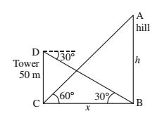 The angle of elevation of the top of a hill at the foot of a tower is 60º and the angle of depression from the top of tower to the foot of hill is 30º. If tower is 50 metre high, find the height of the hill.