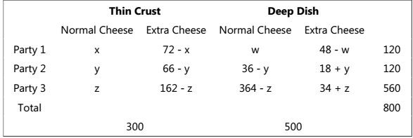 1. Thin Crust pizzas delivered to party 3 = z + 162 – z = 162