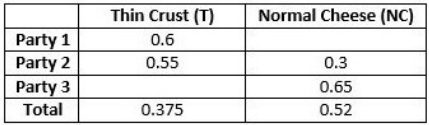Pizzas could be of Thin Crust (T) or Deep Dish (D) variety and come in either Normal Cheese (NC) or Extra Cheese (EC) versions. Hence, there are four types of pizzas: T-NC, T-EC, D-NC and D-EC. Partial information about proportions of T and NC pizzas ordered by the three parties is given below: