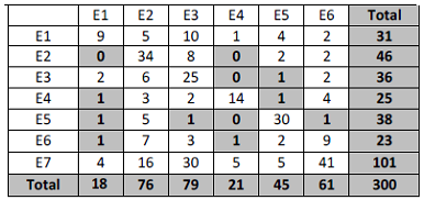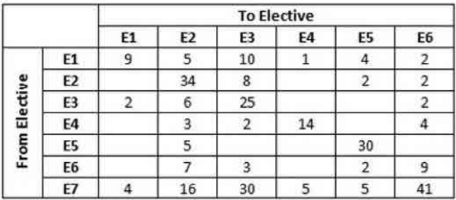 There were seven elective courses - E1 to E7 - running in a specific term in a college. Each of the 300 students enrolled had chosen just one elective from among these seven. However, before the start of the term, E7 was withdrawn as the instructor concerned had left the college. The students who had opted for E7 were allowed to join any of the remaining electives. Also, the students who had chosen other electives were given one chance to change their choice. The table below captures the movement of the students from one elective to another during this process. Movement from one elective to the same elective simply means no movement. Some numbers in the table got accidentally erased; however, it is known that these were either 0 or 1.